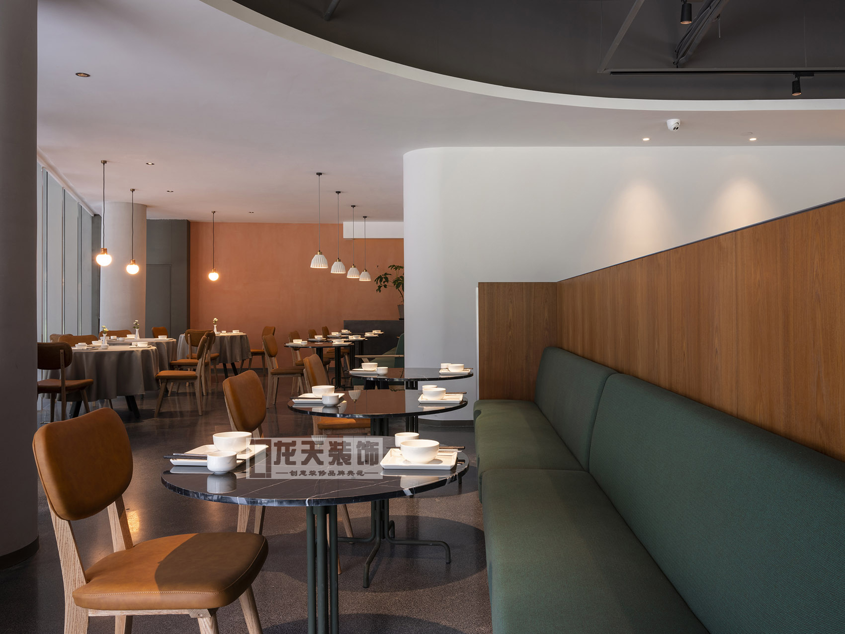 餐廳由水吧與吧臺、多人與單人餐區、包間區域組成,覆蓋了寫字樓環境中不同時段與不同客群的需求。靠窗區域的大面積落地窗,為用餐的客人帶來通透的景觀。多人餐區以合理的布局營造著餐桌之間的“舒適距離”,包間與長桌的設置則對應著不同屬性的社交場景。每一區域的設置,都圍繞著整體的舒適度與體驗感展開,既相對獨立,又保留了區域之間互動與連結的可能;在寫字樓本身相對規整的環境中,形成層次變化的“共餐”與社交氛圍。