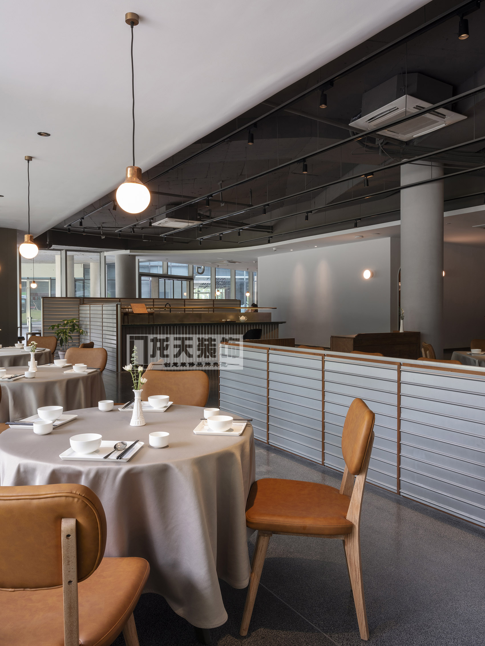 以深色水磨石作為主要材質,立面則采用相對輕盈的鋁板,以精密的結構比例與柚木銜接而成。具有現代感的鋁板與柚木的溫暖質感相結合,形成視覺與感知的對比,為空間注入年輕的氣質與持續的美感。來自西班牙的燈具品牌的吊燈,簡潔現代的造型與家具的皮質餐桌椅相呼應,搭配淺色桌布,提升空間整體的舒適感與飽和度。