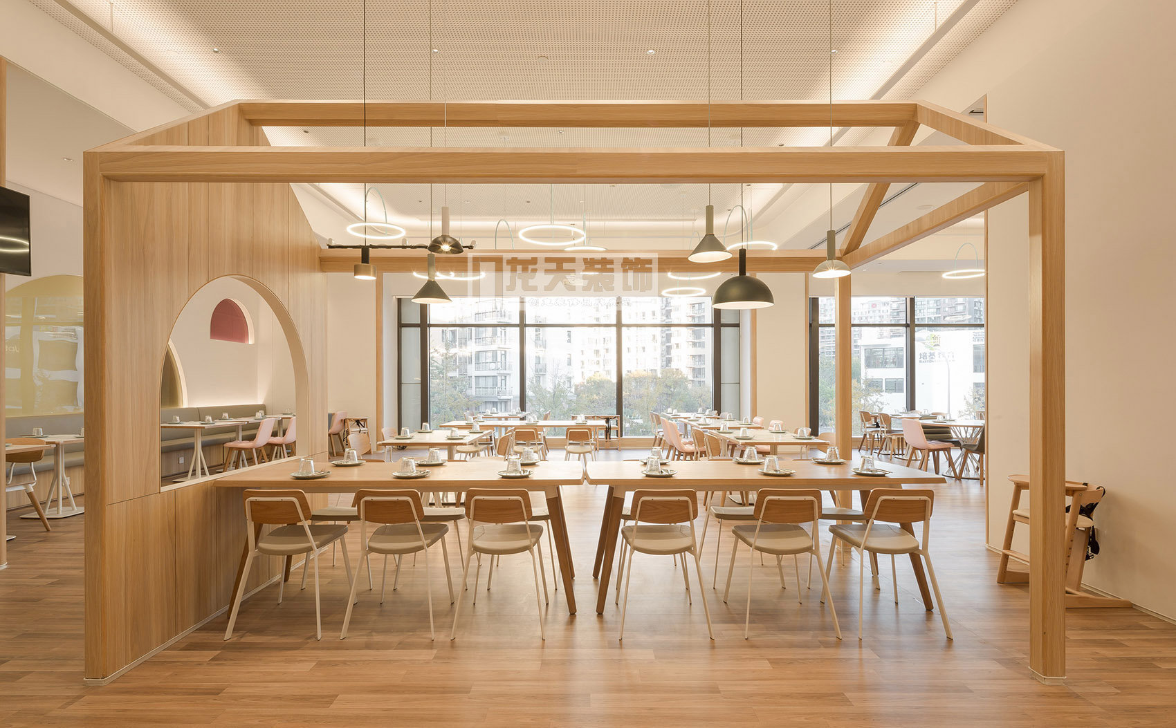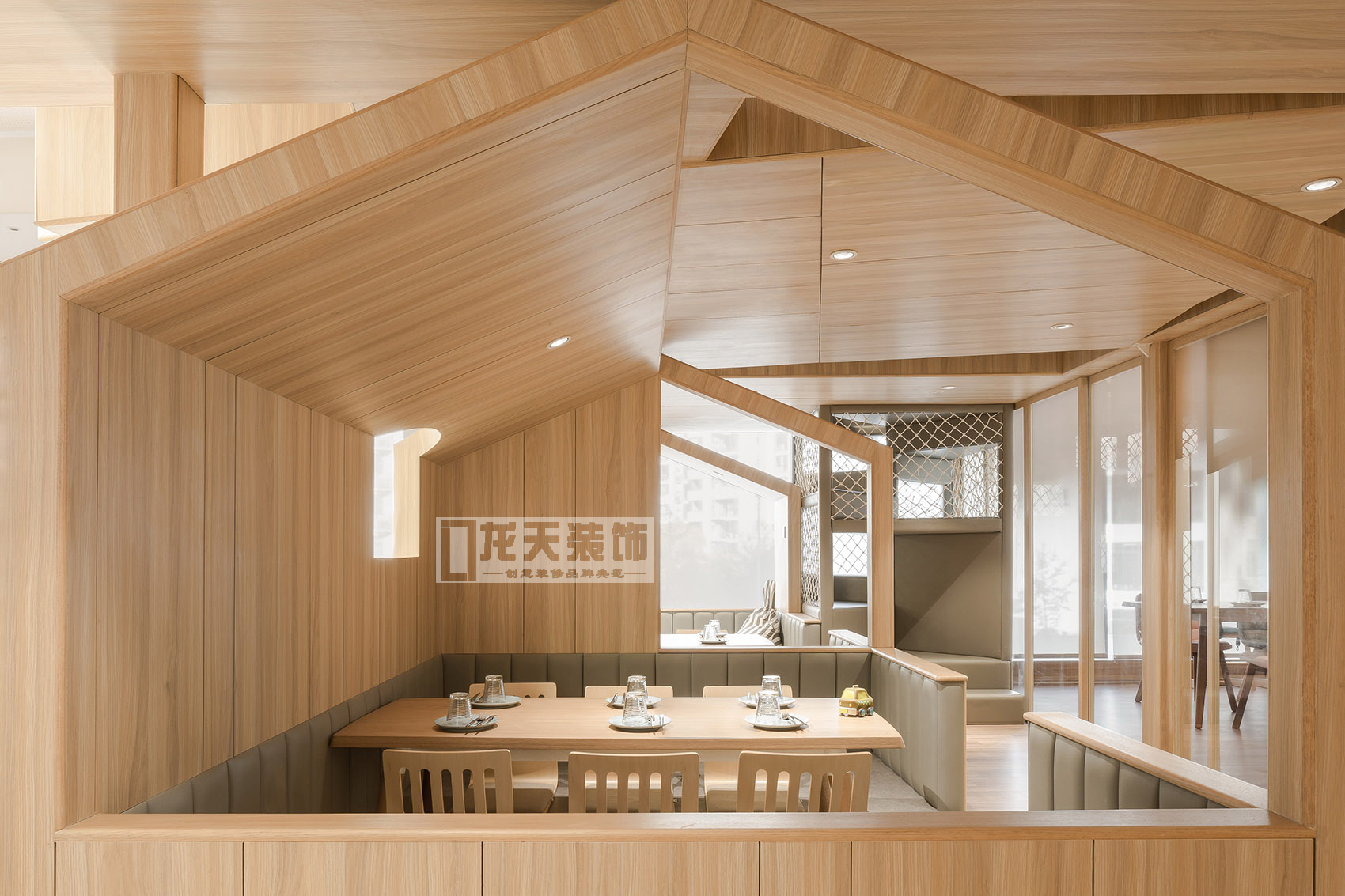“樹屋”的概念貫穿了整個餐廳的空間設計,一個個錯落在空間里的小房子構成了不同的兒童體驗空間,與就餐的大堂形成半圍繞的結構,空間疏密相互呼應。