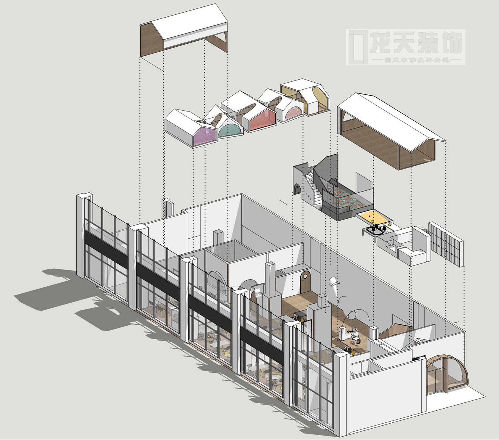 大廳的盡頭便是整個空間最最有趣的樹屋聚落。層錯的小屋彩色的玻璃窗,玻璃的顏色不僅來區分空間又與視覺系統相呼應。下層的小屋是包廂、兒童的休息室。