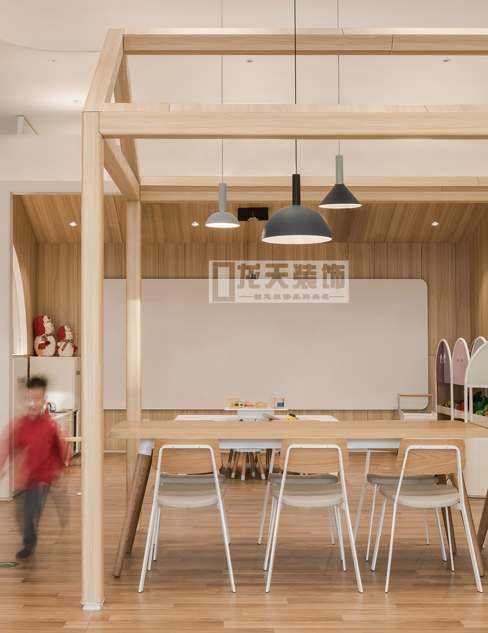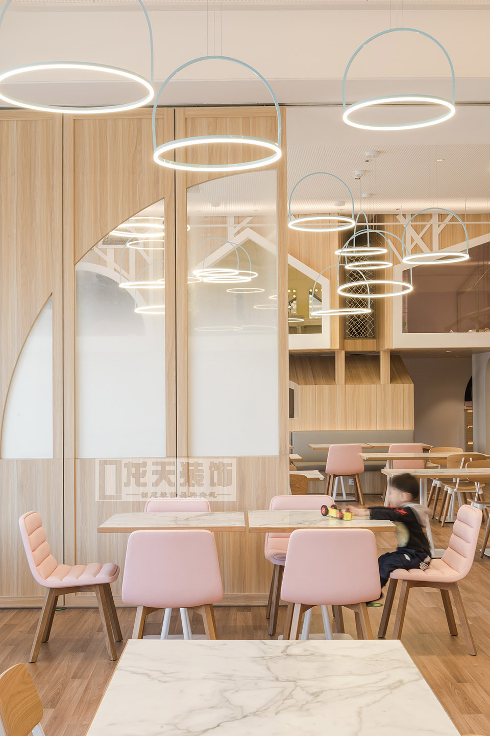 而餐區的右邊,以框架構筑的小屋為界限,分隔了餐區域與兒童體驗區域,各種不同場景的體驗活動,令成年人也羨慕不已。